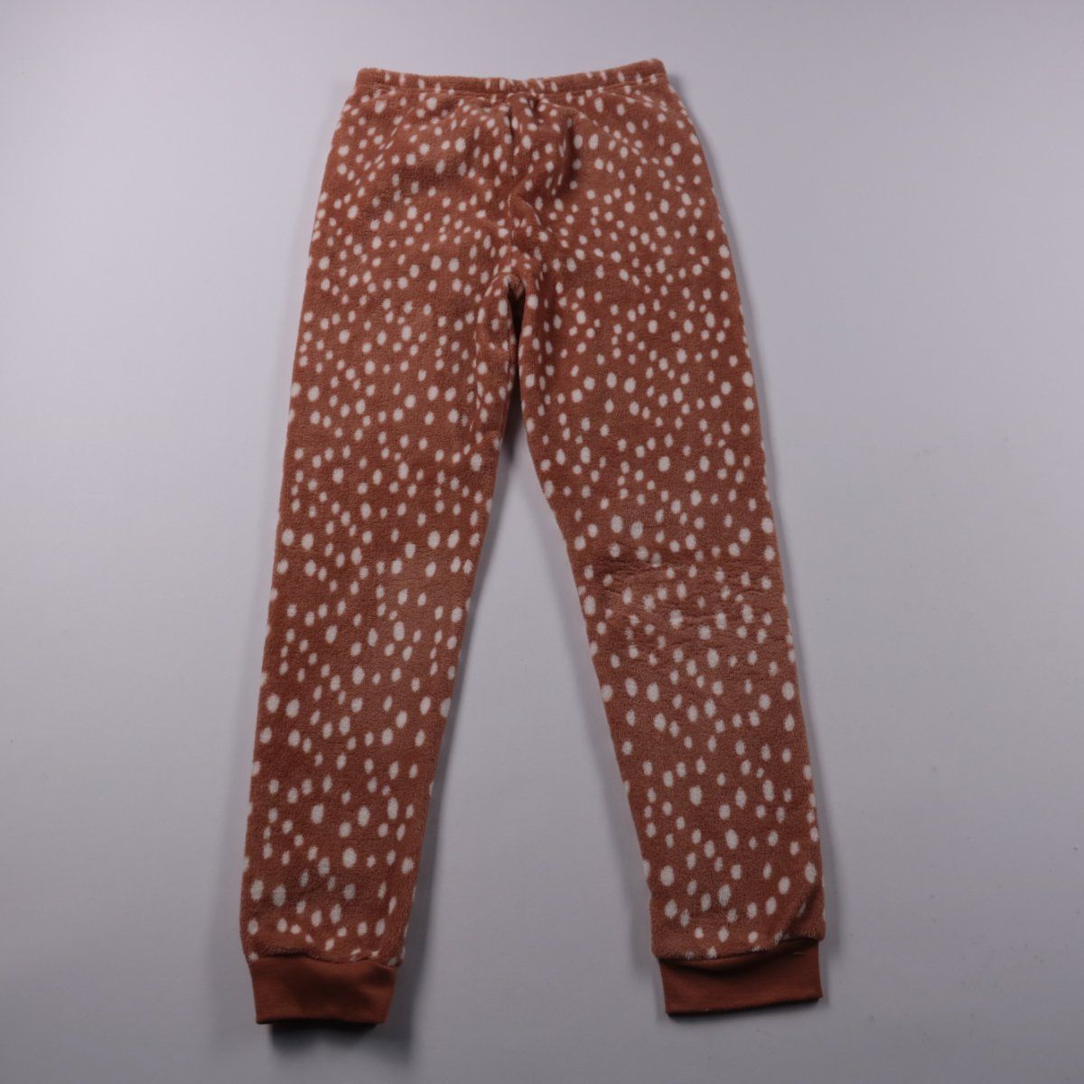 Тёплые легинсы Primark из мягкого флиса с принтом в белый горошек. Подойдут для дома и прогулок в холодное время года, хорошо тянутся и не стесняют движений. Эластичный пояс и манжеты по низу помогают удобной посадке и сохраняют тепло.
