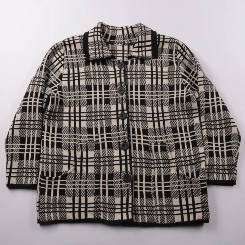 Вязаный кардиган для девочки с воротником, застёжкой на пуговицы и узором в клетку. Подойдёт для школы и прогулок в прохладную погоду, удобно носить поверх футболки или водолазки. Практичен за счёт плотной вязки и свободного кроя, который не сковывает ...