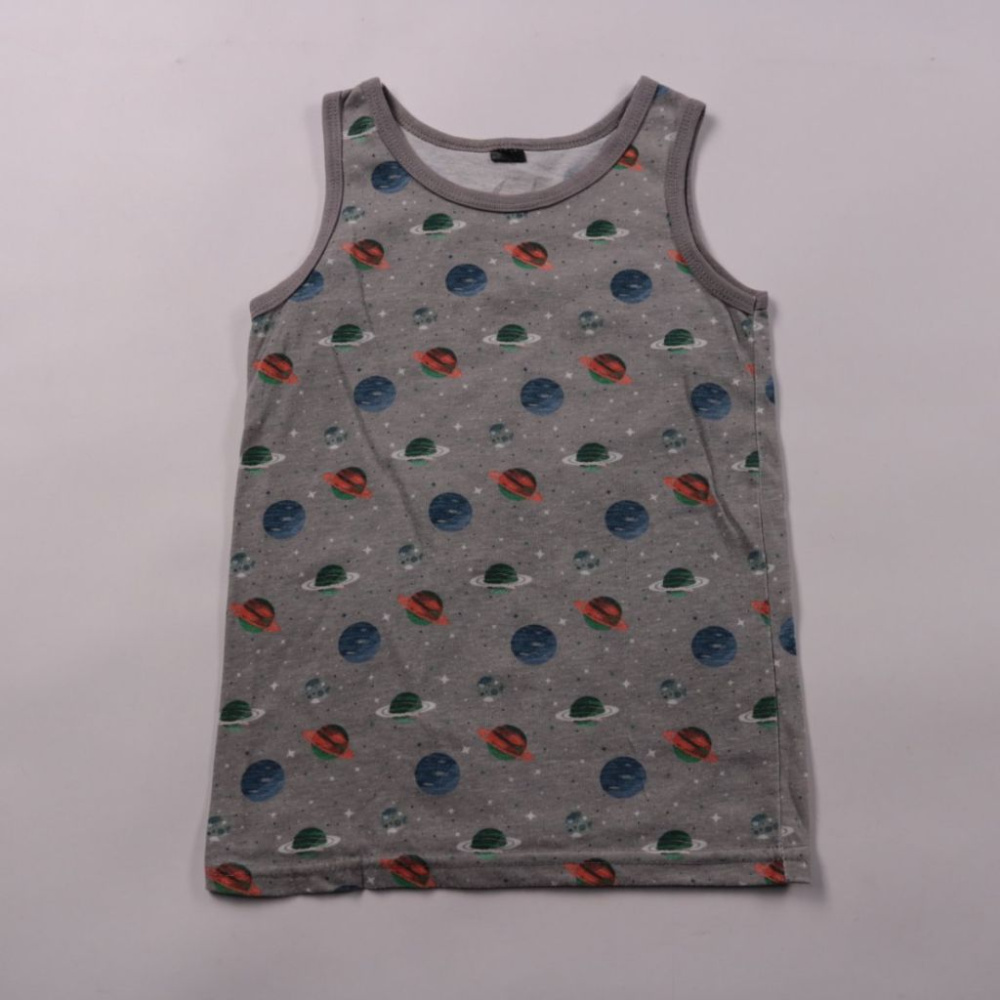 Детская майка для мальчика с принтом планет на сером фоне, без бренда на бирке. Подойдёт для лета, дома, сна и прогулок в жаркую погоду. Лёгкая и удобная, не стесняет движений.