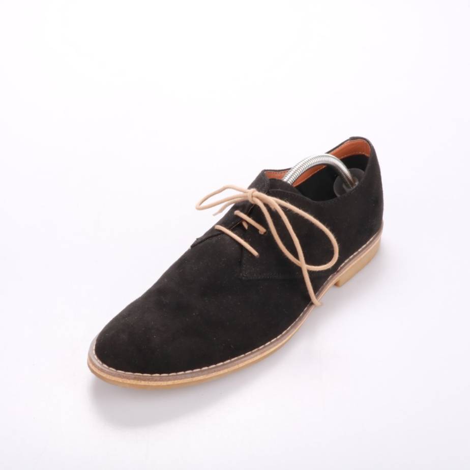 Мужские туфли H&M из чёрной замши на шнуровке. Подойдут для офиса и повседневных образов в демисезон, хорошо сочетаются с брюками и джинсами. Светлая подошва меньше скользит и проще в уходе.