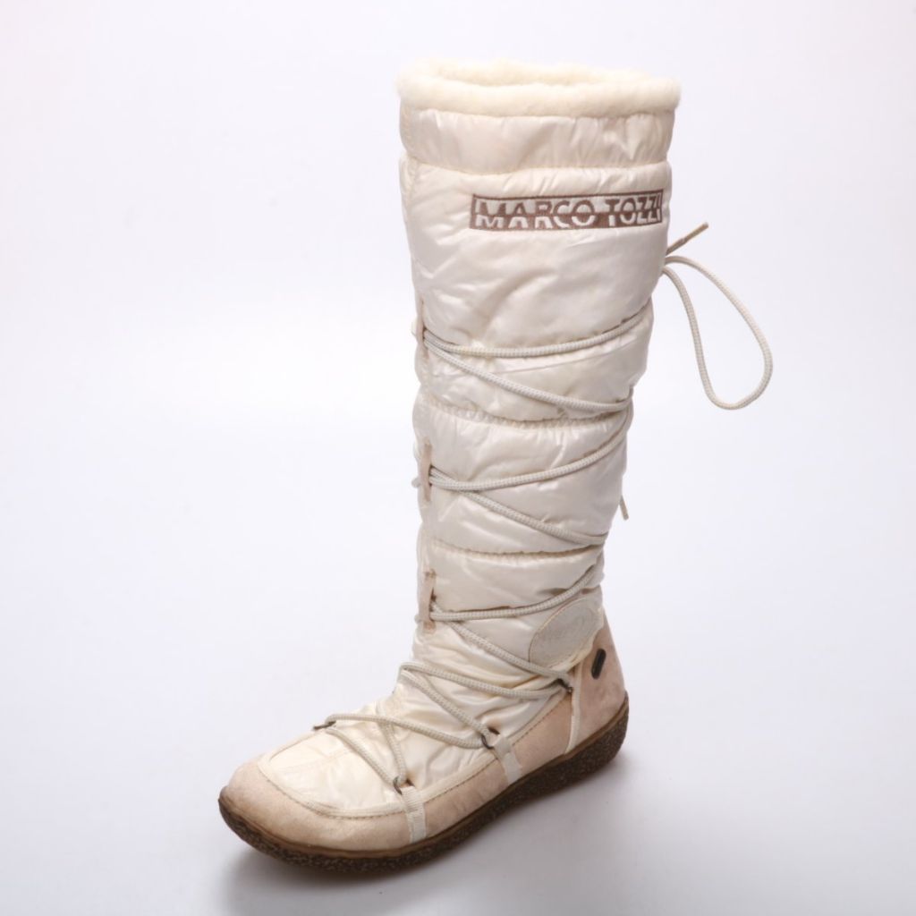 Женские зимние сапоги Marco Tozzi белого цвета, высокий стеганый верх на шнуровке. Подойдут для холодной погоды и прогулок по городу. Мягкая подкладка по верху голенища и рельефная подошва помогают сохранять тепло и устойчивость.