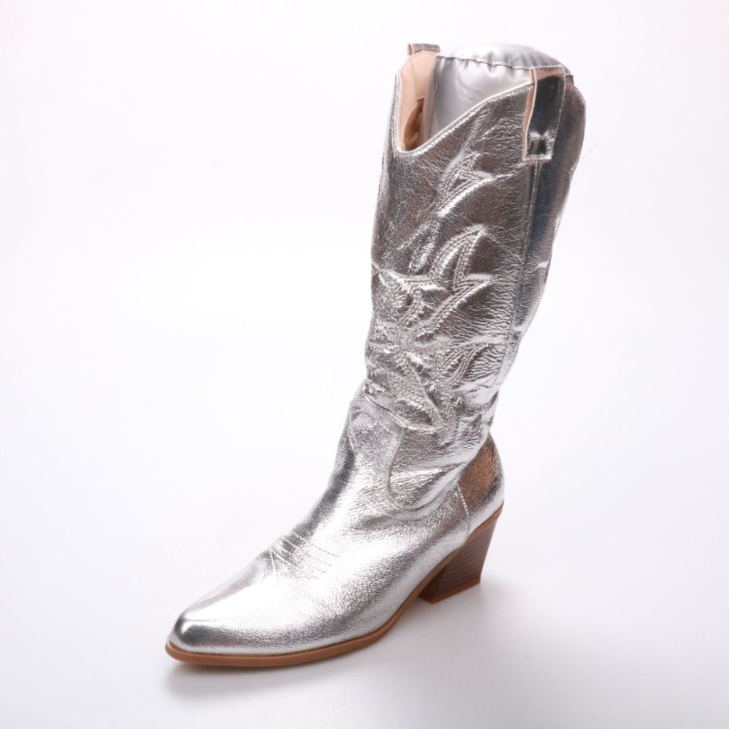 Женские сапоги-казаки в серебристом металлизированном цвете, бренд не указан. Высокое голенище с декоративной вышивкой и устойчивый каблук подойдут для образов в стиле casual и western в демисезон. Практичное преимущество — удобная посадка и нескользящ...