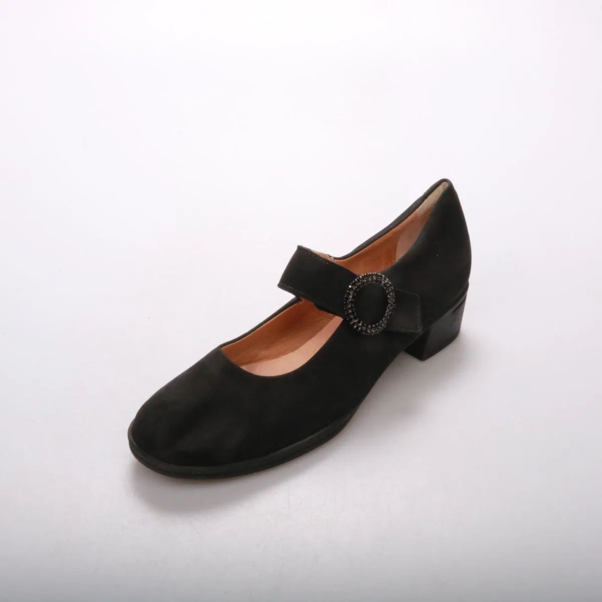 Женские туфли Hotter в чёрном цвете с ремешком (Mary Jane) и устойчивым невысоким каблуком. Подойдут для офиса и повседневной носки в демисезон, хорошо сочетаются с платьями и брюками. Практичное преимущество — удобная посадка за счёт фиксирующего ремешка и нескользящая подошва.