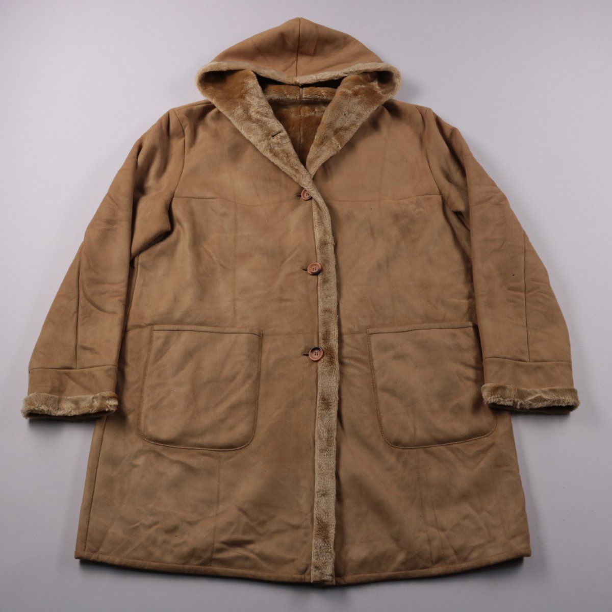 Женская дублёнка Jane Taylor с капюшоном, в бежево-коричневом оттенке и меховой отделкой по борту и манжетам. Подойдёт для зимних прогулок и повседневной носки в холодную погоду. Практичный плюс — застёжка на пуговицы и большие накладные карманы для мелочей и рук.