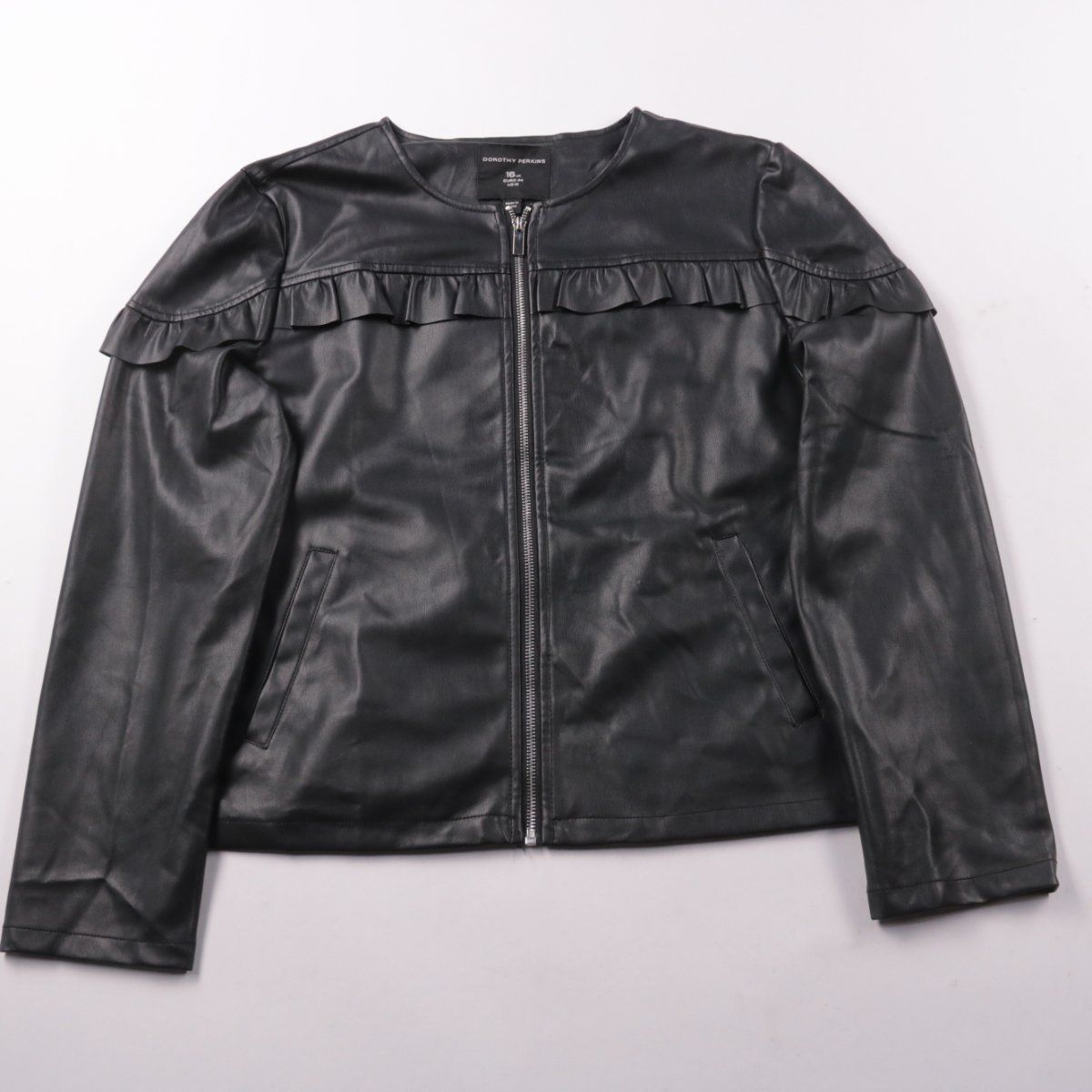 Женская куртка Dorothy Perkins из экокожи, чёрного цвета, на молнии и с декоративной оборкой по линии груди/плеч. Подойдёт для повседневных образов в прохладную погоду весной и осенью. Практичный материал легко протирать и он не требует сложного ухода.