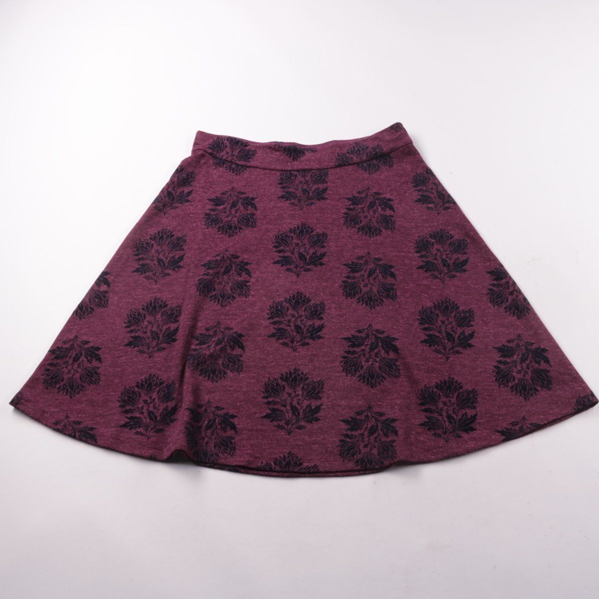Юбка White Stuff А-силуэта бордового цвета с чёрным растительным принтом. Подойдёт для повседневных образов в офис или на прогулку. Ткань с добавлением эластана немного тянется и комфортно садится по фигуре.