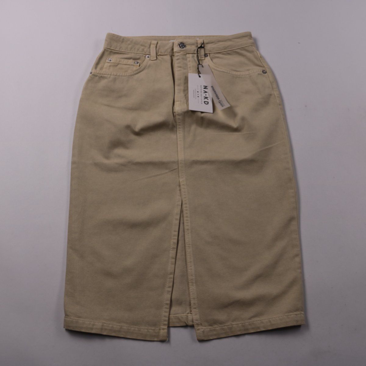 Юбка NA-KD прямого кроя из плотного хлопка бежевого цвета, с застёжкой на молнию и пуговицу и разрезом спереди. Подойдёт для повседневных образов и офиса в сочетании с рубашкой, джемпером или футболкой. Плотная ткань хорошо держит форму и удобна в носке.